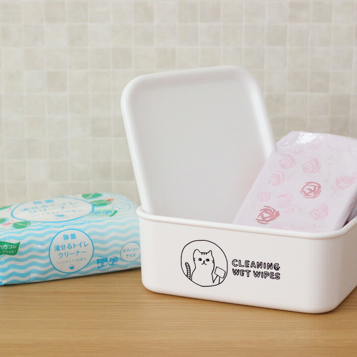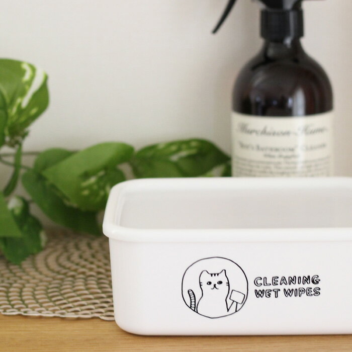 シート詰め替え用容器 クリーナーシートBOX 真っ白の容器に手書き風の可愛らしいネコのイラストが描かれた、クリーナーシートボックス。